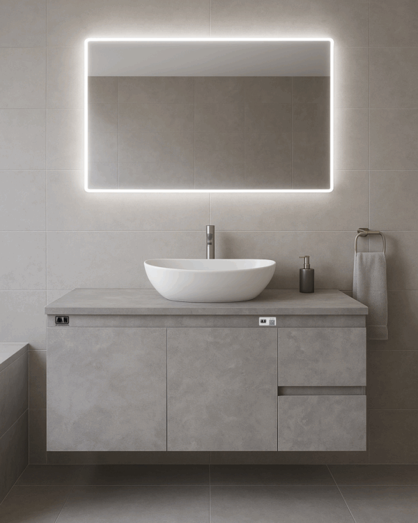 Diseñado para mesada del mismo material que el mueble con una bacha de apoyo y opcional mesada de piedra natural y bacha de apoyo.
